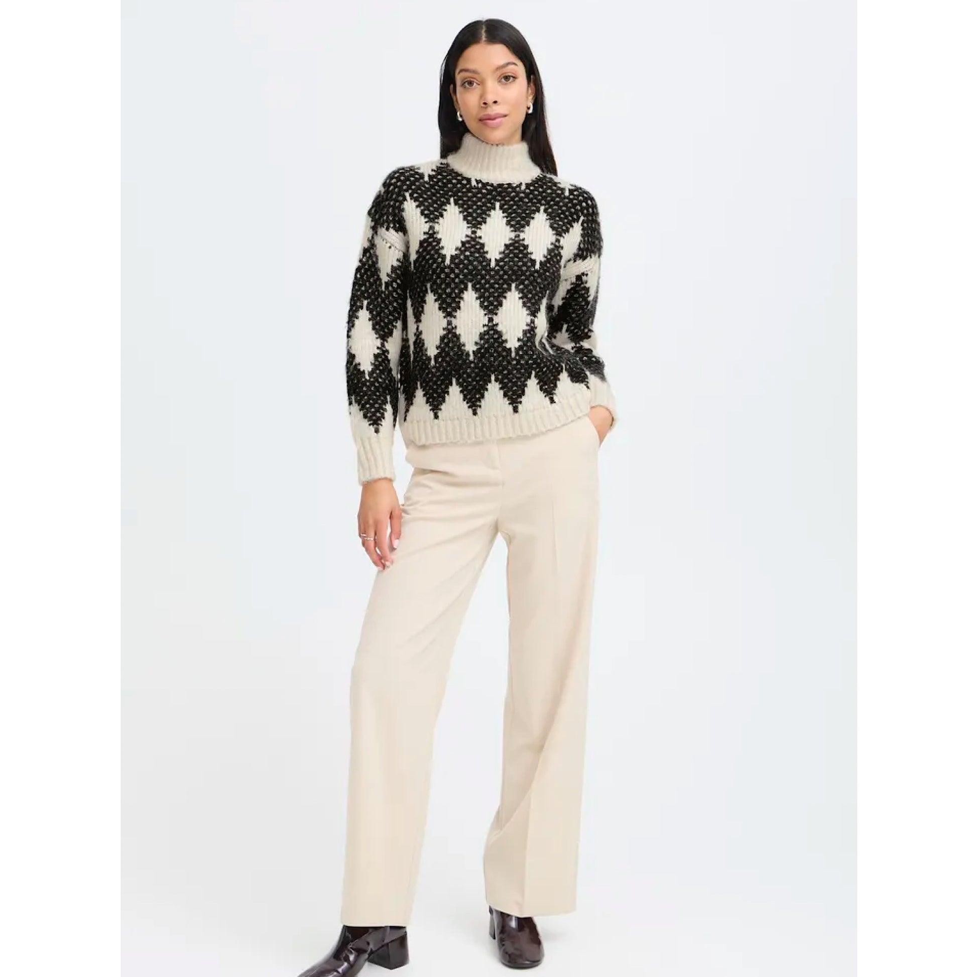 Cosy up in style with the B.Young Omhu Jumper. With a jacquard knit and roll neck design, this monochrome jumper offers a relaxed fit and short length for a comfortable and fashionable look. Perfect for any occasion.