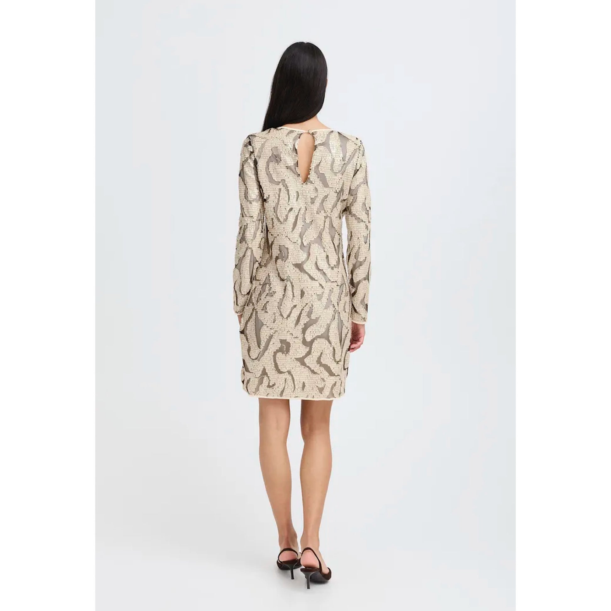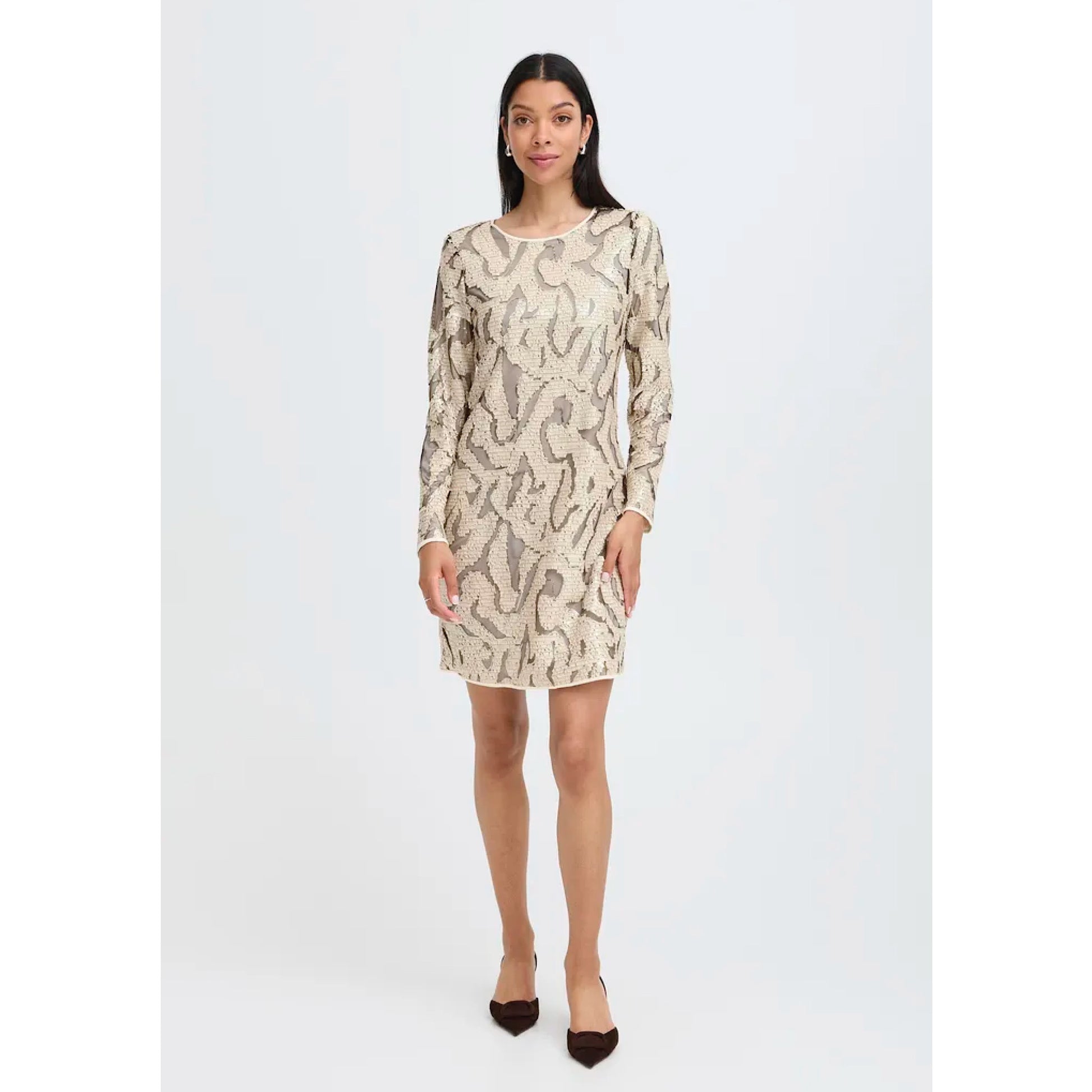 Get ready to sparkle and shine in the B.Young Rese Dress! This short, cream-colored dress is adorned with sparkly sequins, perfect for any party. Its long sleeves add elegance and its chic design will have all eyes on you. Your go-to for a night out!