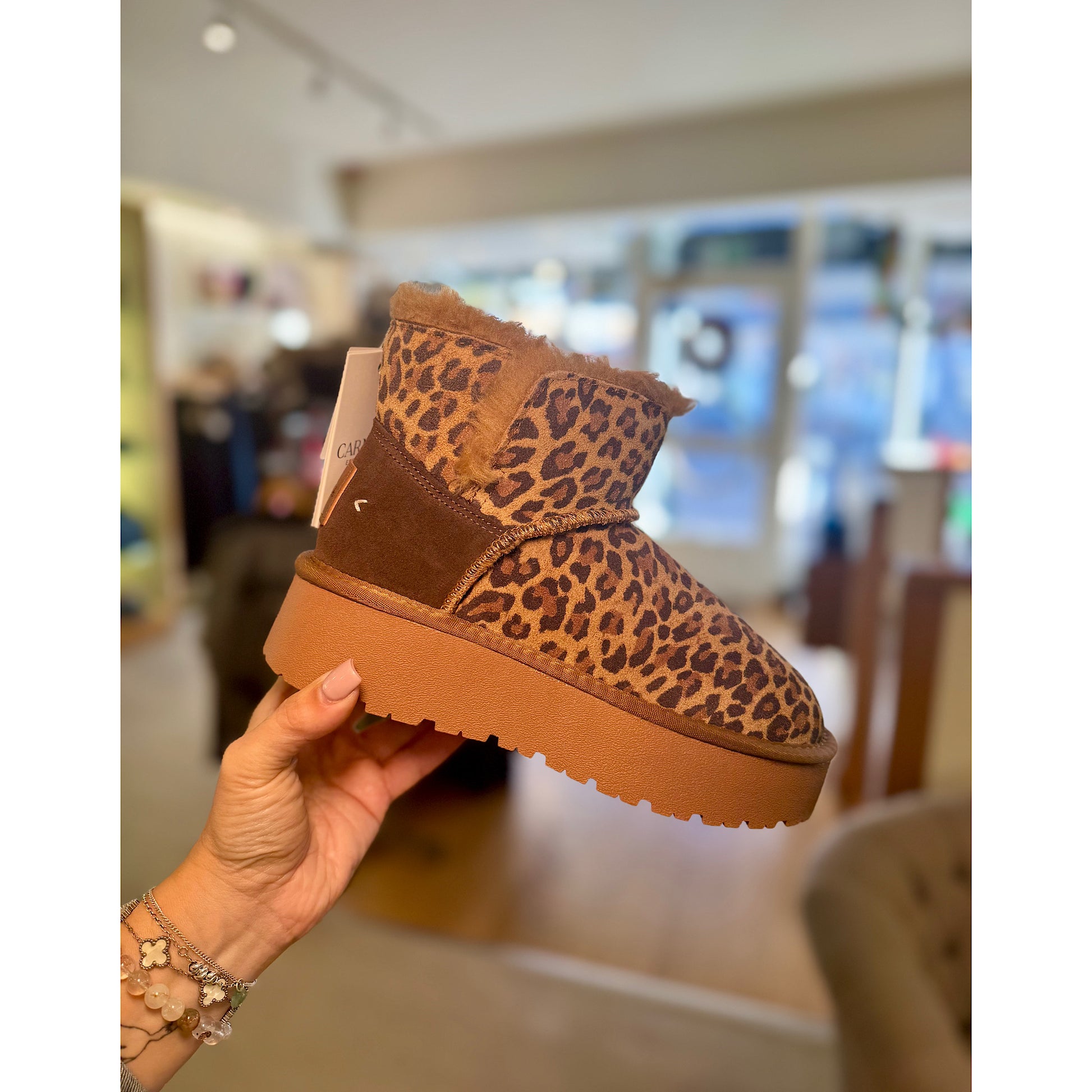 Introducing the Carmela Leopard Boot - a winter staple for stylish women. Made of soft suede and lined with a cosy lining for maximum warmth. With an Australian boot style and a rear pull tab for easy on and off, these boots are both functional and fashionable. Non-slip rubber sole ensures safety.