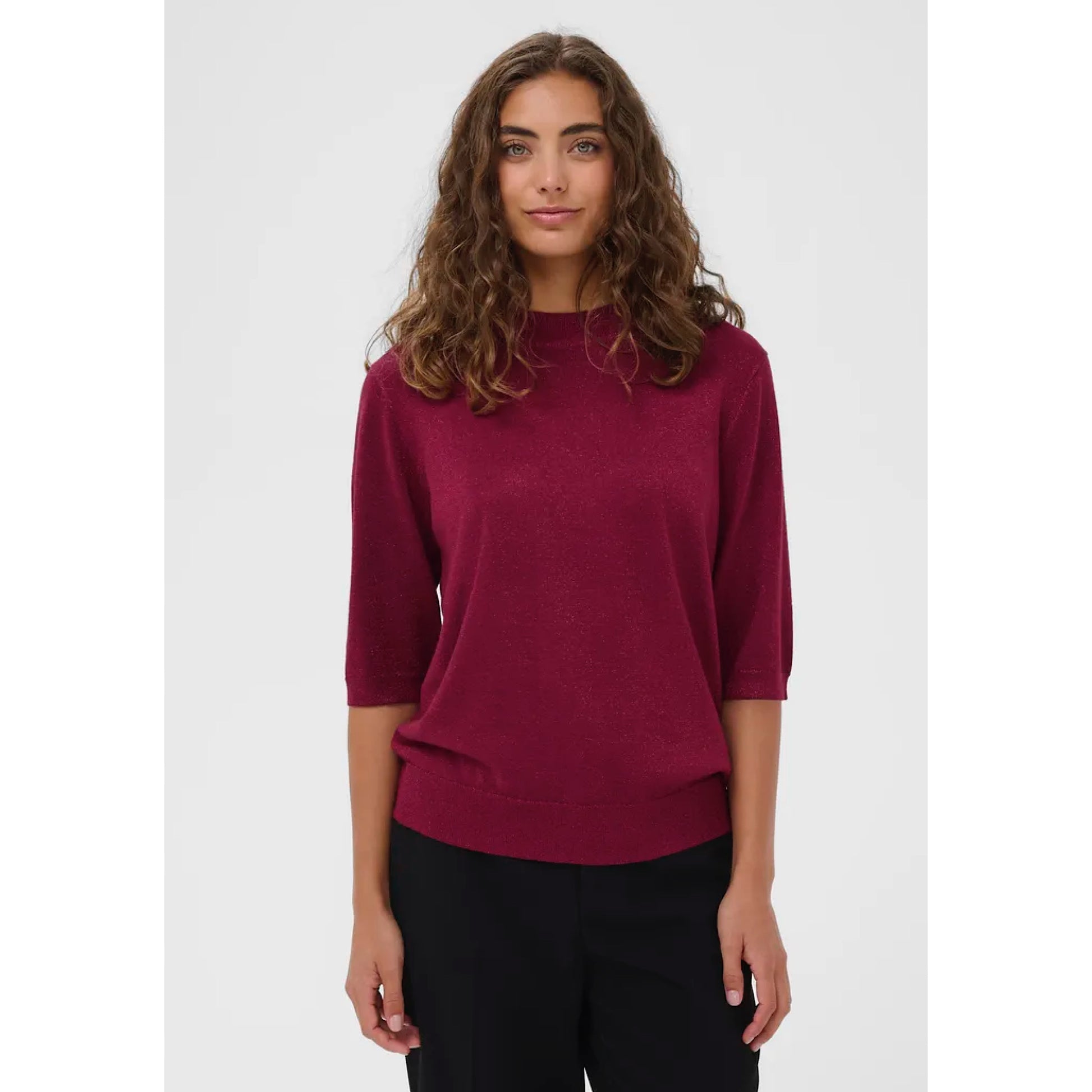 Introducing the Culture Fay Top - the perfect addition to your wardrobe for all occasions. With its metallic yarn, this top adds a touch of sparkle to any outfit. Its relaxed fit and short sleeves provide comfort, while the crew neck adds a touch of elevated style. A must-have for any fashion-forward individual!