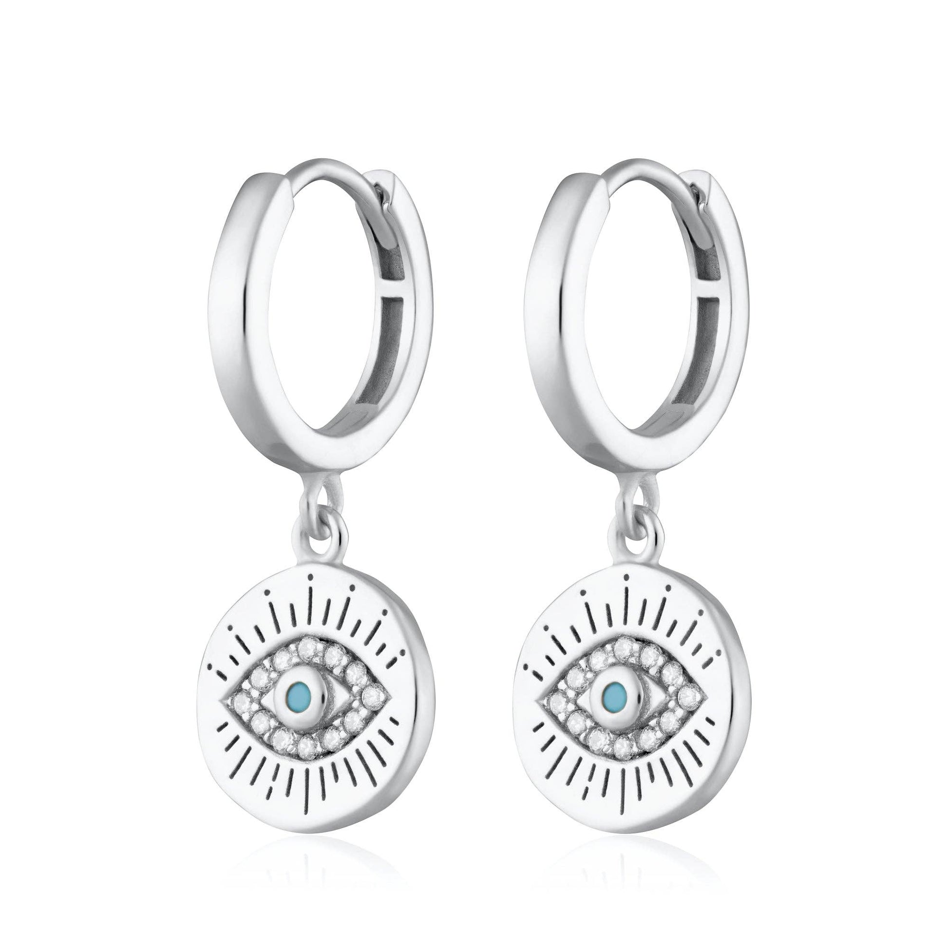 Dimensions: 13mm external diameter, 9mm internal diameter, Evil Eye Disc 10mm diameter • Product Type: Charm Huggie Hoops with hinged clasp Mystical evil eye charm hoops featuring protective symbol with clear and turquoise cubic zirconia stones.