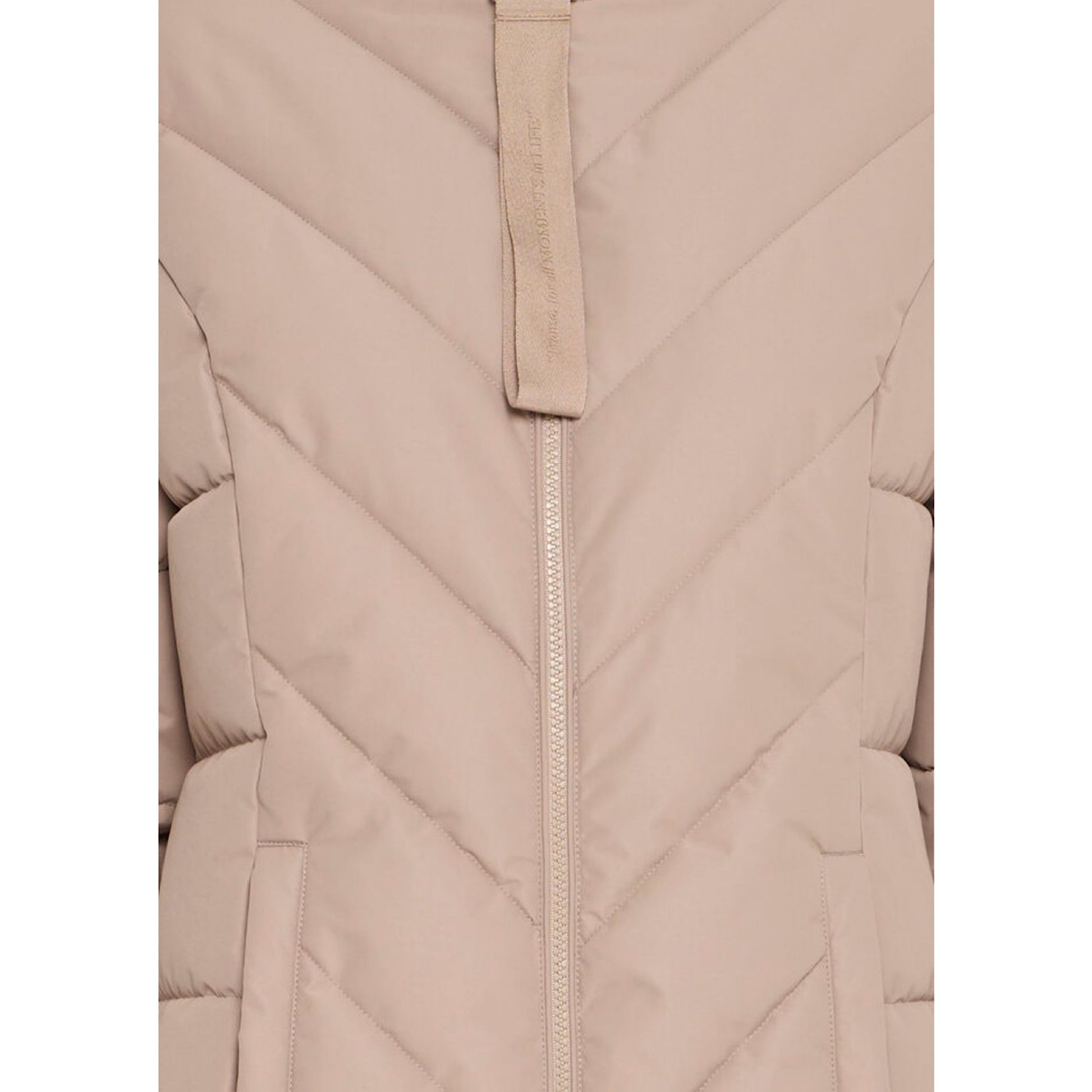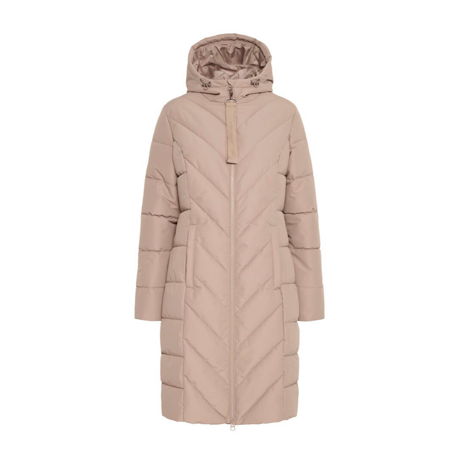 Stay warm and stylish with the Fransa Maise Coat. This quilted, hooded coat in desert taupe features a unique chevron quintet design. The mid-calf length adds a touch of sophistication. Zip up and stand out in this must-have coat.