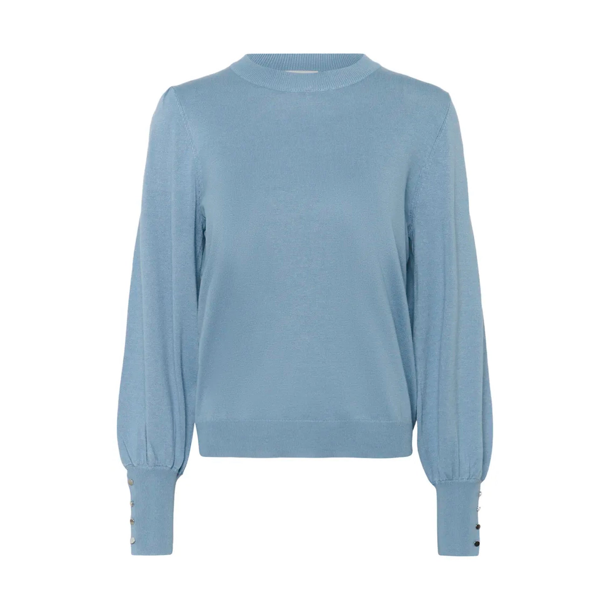 Introducing our Kaffe Lizza Button Top, featuring a playful wayward blue color and unique button detail on the cuff. The balloon sleeve and crew neck add a touch of whimsy to this must-have top. Get ready to make a statement with this fun and fashionable piece!