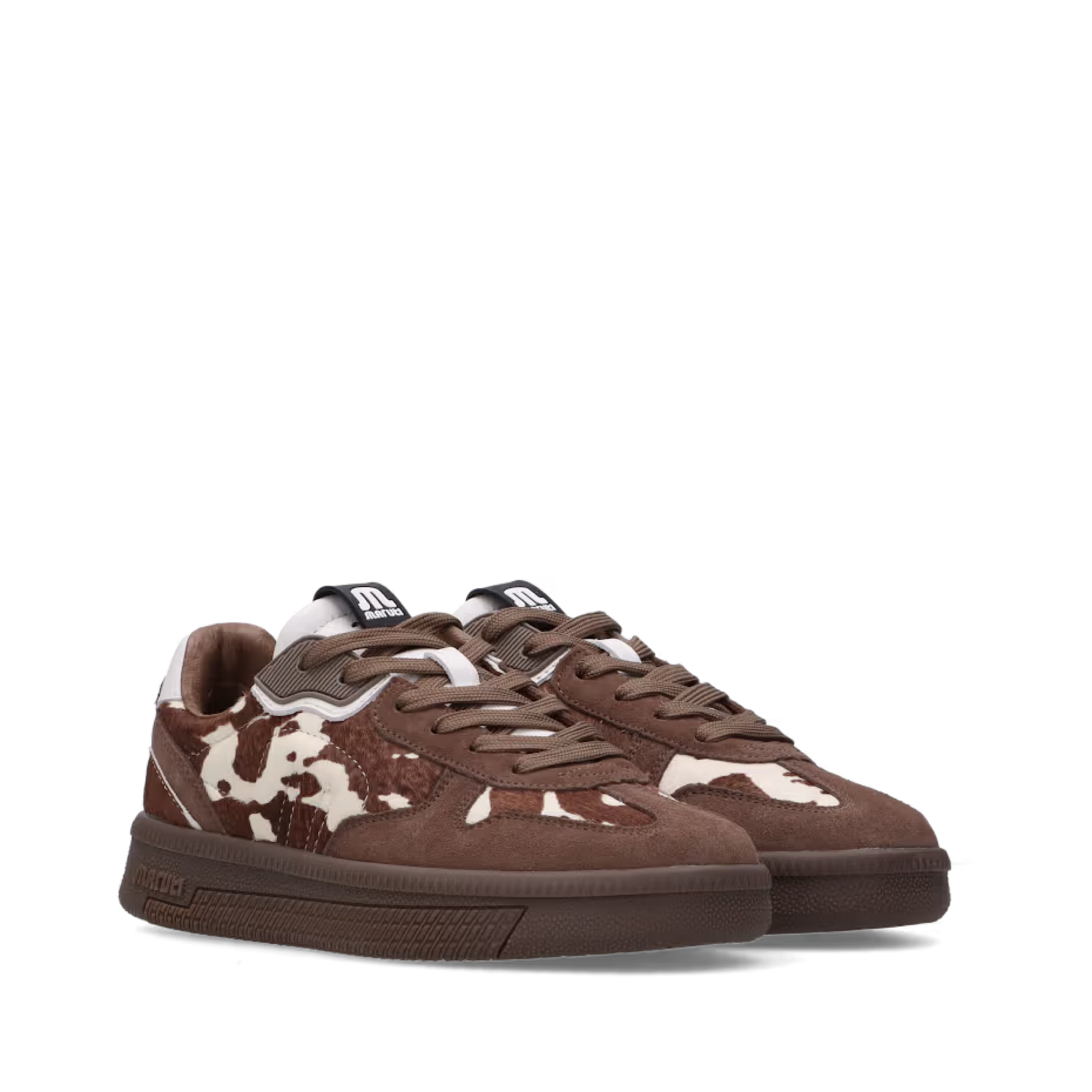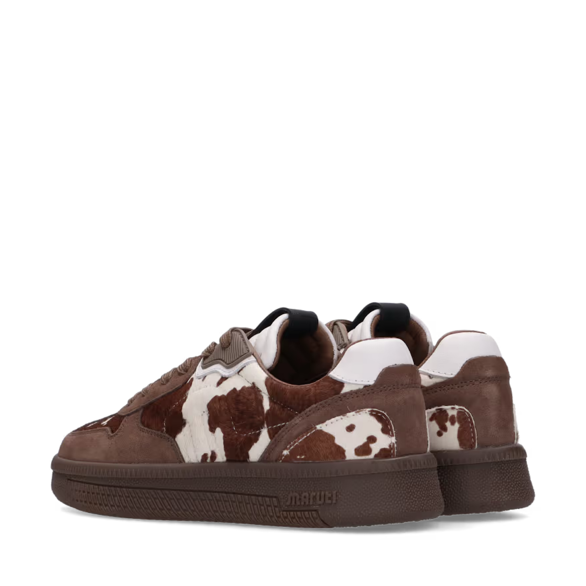 Introducing Maruti's Yale Cow Trainers - the perfect statement piece for fall fashion. Featuring a bold brown and white cow print with soft suede details, these low-cut sneakers are both playful and stylish. The rubber sole provides comfort and grip, making them perfect for city adventures. Complete the look with straight-leg jeans, corduroy trousers, or a wool overshirt. (And don't forget the playful Maruti branding!)