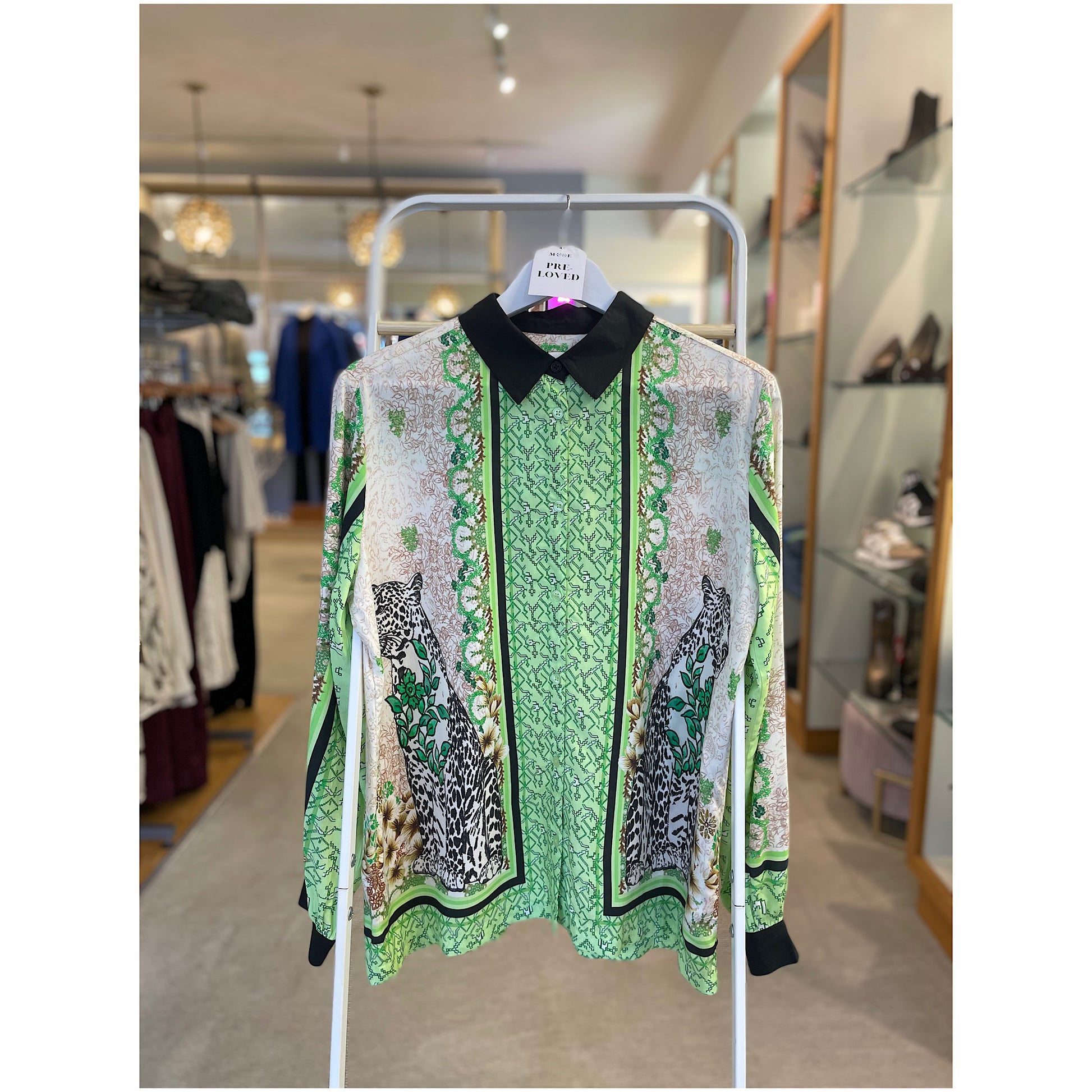 Cream and green leaf and leopard design blouse, with collar, button front and long sleeve.