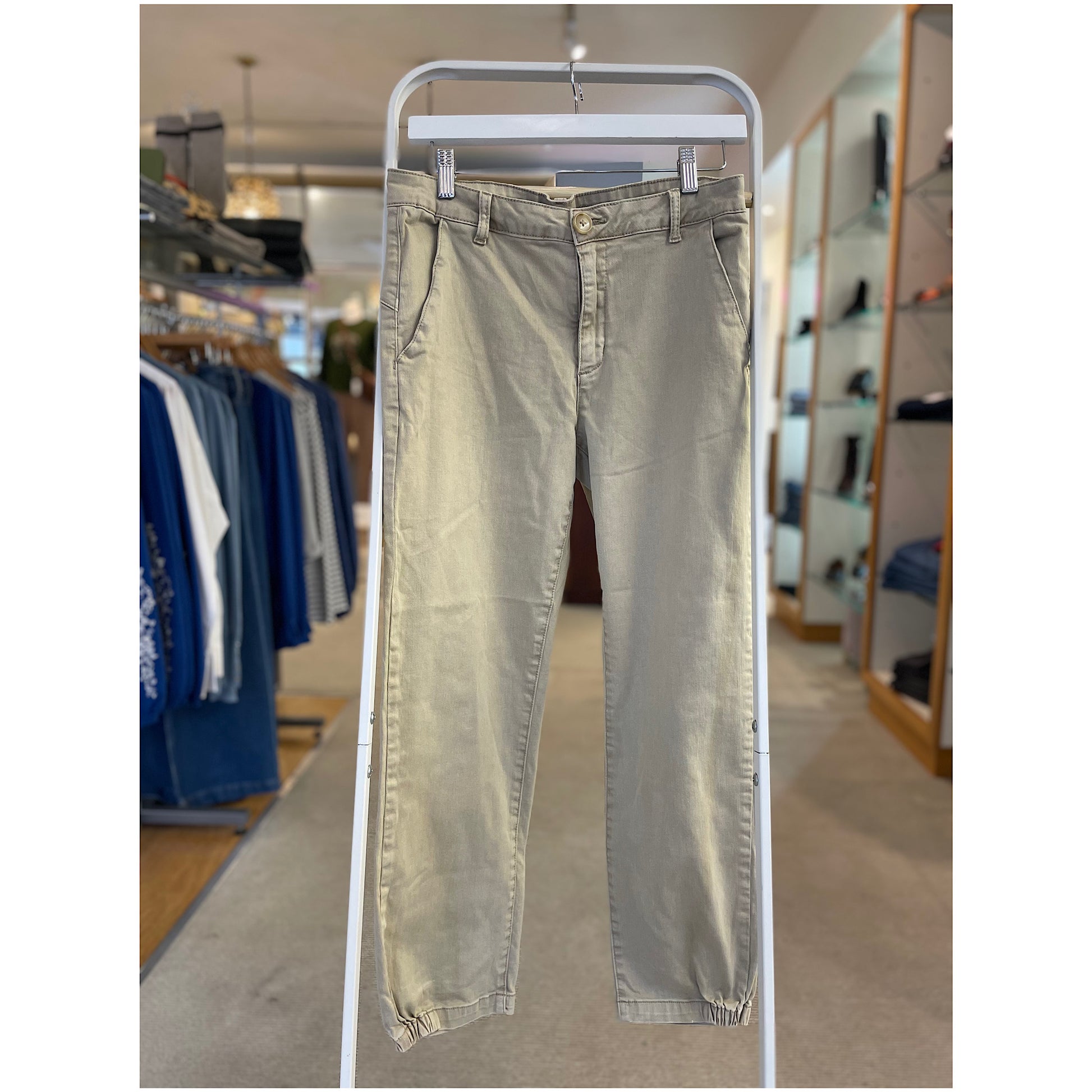 Malou fit, mid waist, straight leg trousers with half elasticated cuff ankle and a button and zip front in a beige colour.