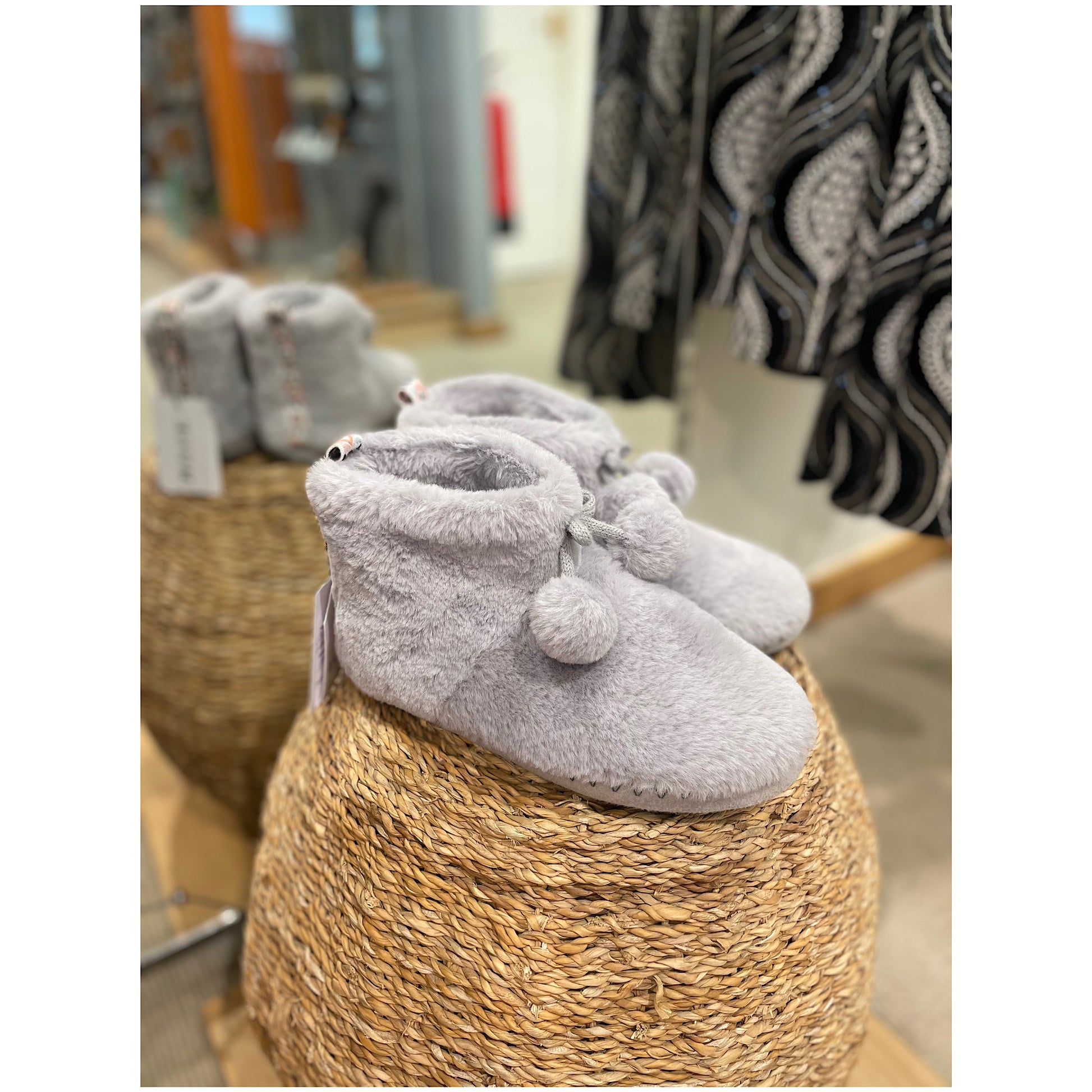 Soft grey bootie slippers with bobble tassel.
