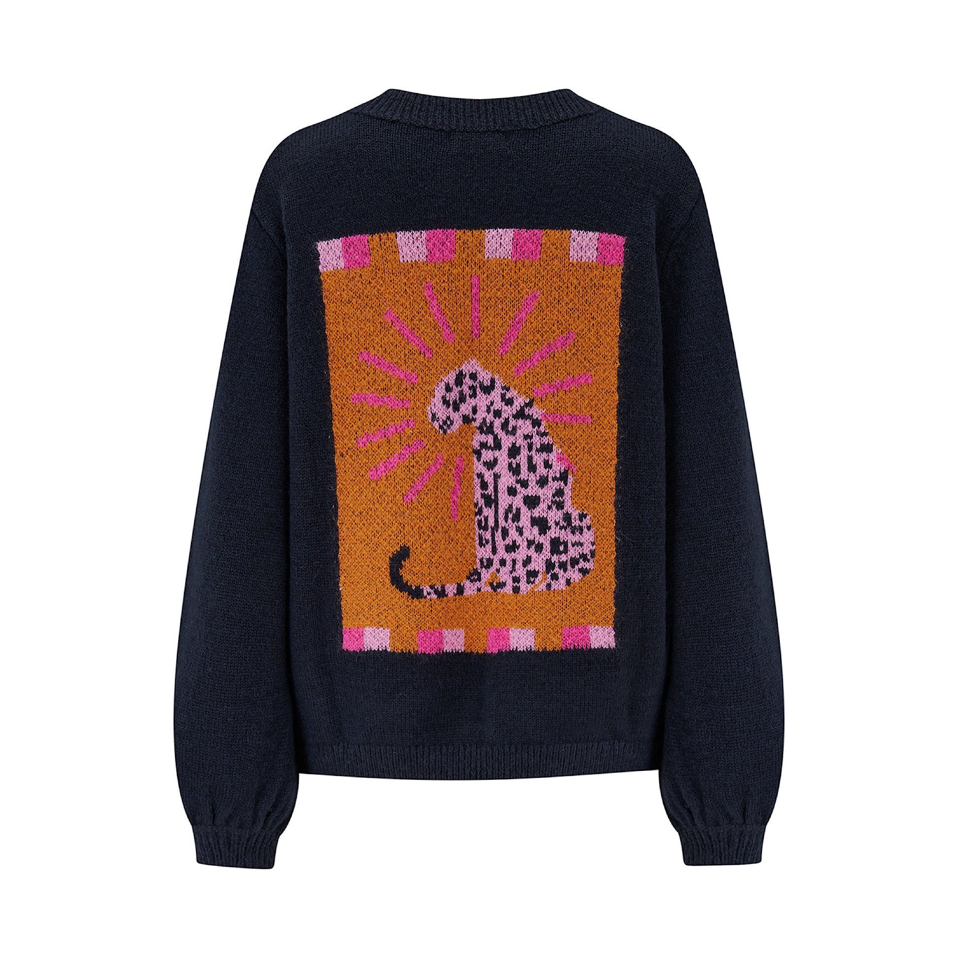 The Essie Jumper is a cosy, relaxed-fit knit designed for effortless everyday wear. Crafted from thicker textured yarn, it features a ribbed collar and cuffs, statement blouson sleeves, and a slightly shorter length for a modern silhouette. The standout detail? A bold pink leopard motif with navy spots, framed by radiant orange lines and a playful checker pattern – adding a touch of fun to your knitwear collection.