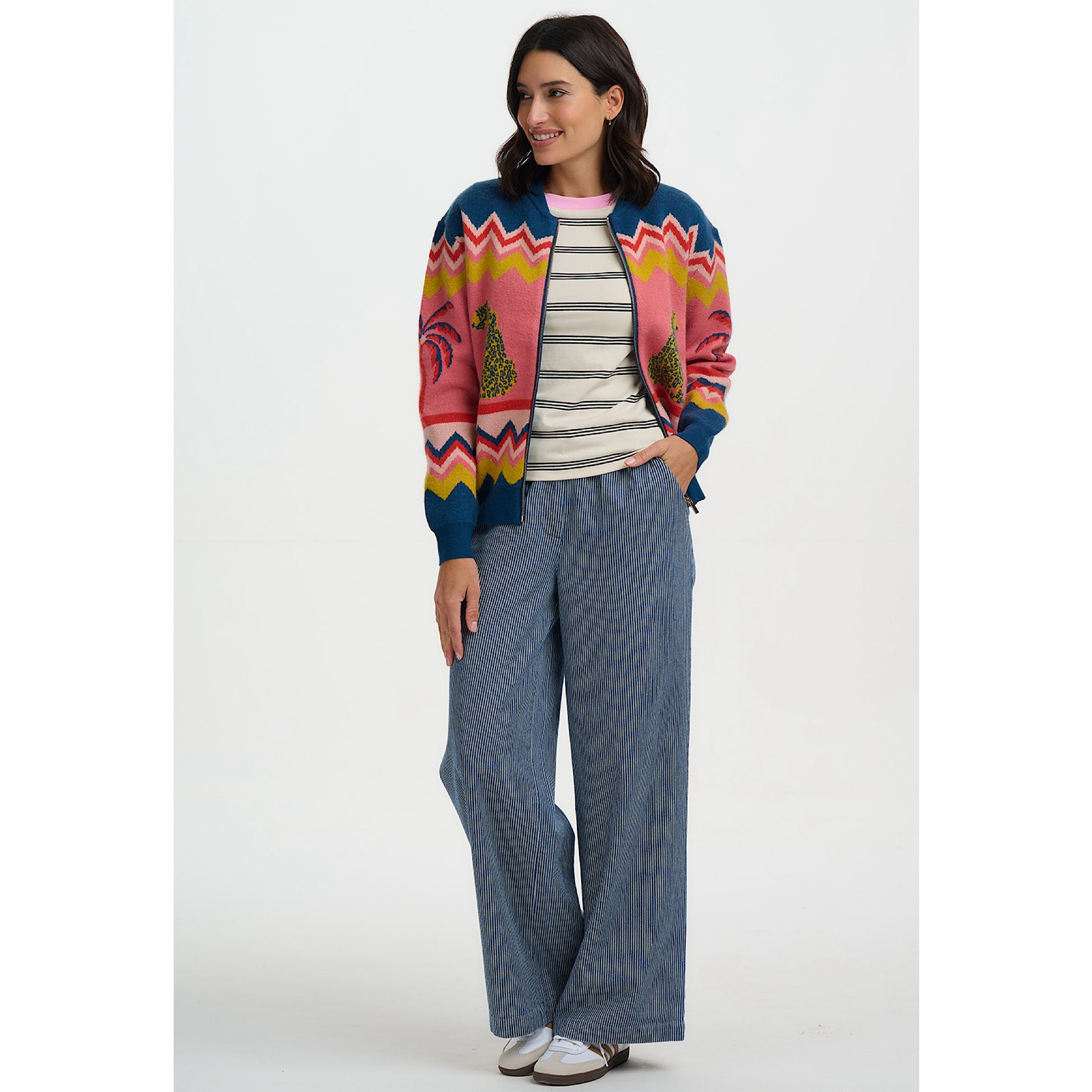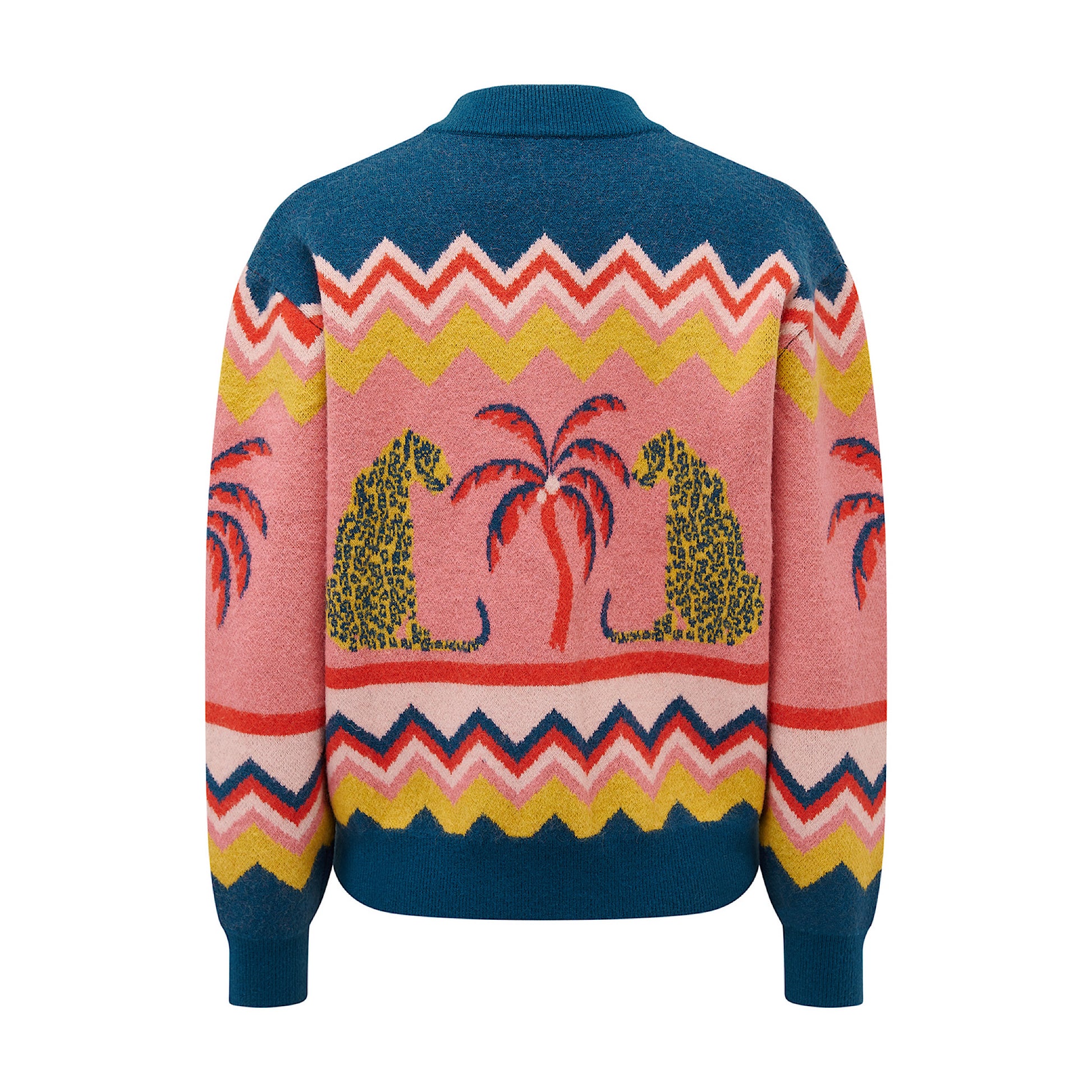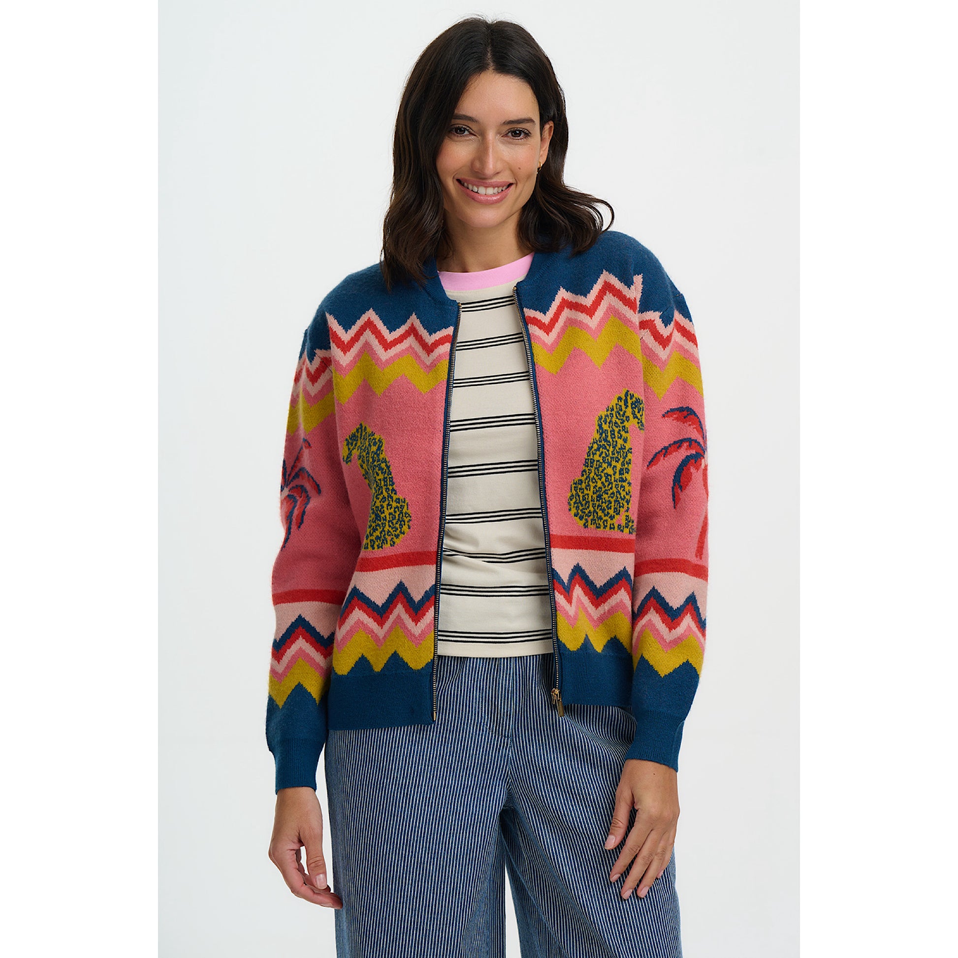 The Solana Knitted Bomber Jacket is a playful yet versatile knit designed with a relaxed fit and a centre zip fastening for easy layering. Crafted in a soft knit, it brings a casual edge to any outfit, perfect for throwing over tees and pairing with jeans. Two stylised leopards flank a palm tree beneath bold zigzag stripes, creating a vibrant, exotic, retro-inspired scene that makes this bomber a true statement piece that’s both cosy and stylish.