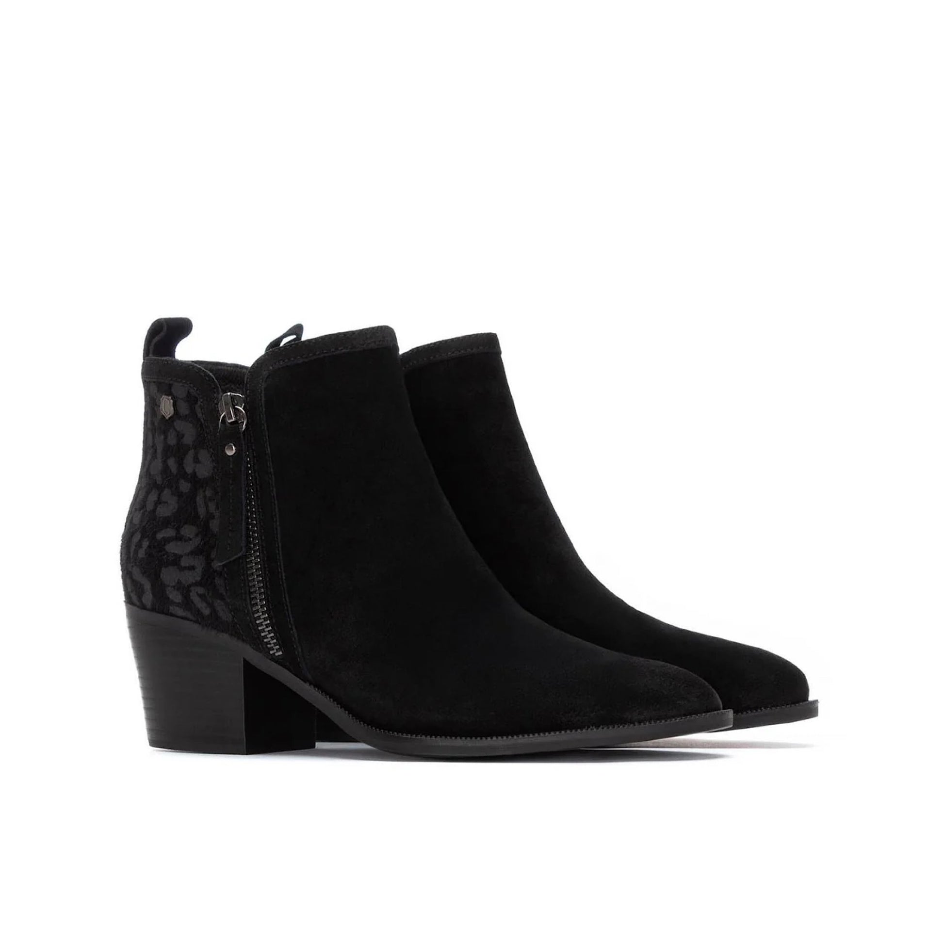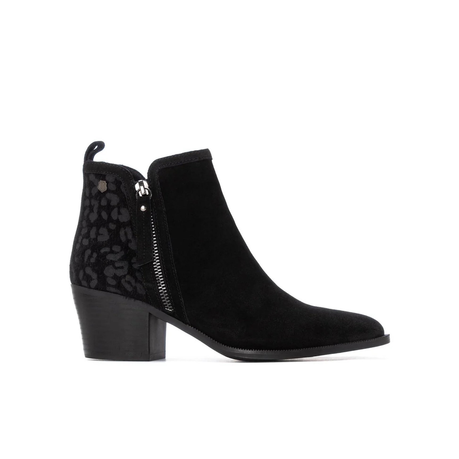 Introducing the Carmela Leopard Heel Ankle Boot - the perfect combination of style and comfort. Made of soft suede with a printed back, this boot will elevate any outfit. The side zipper closure and rear pull tab make it easy to slip on and off, while the non-slip sole ensures safety and stability. Walk with confidence and make a statement with every step.